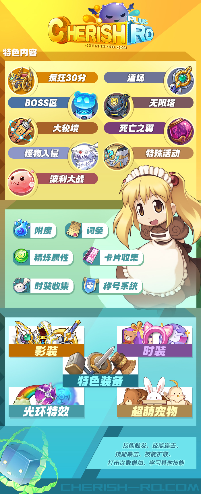 服务器设置 【版本类型】进阶二转 EP13.1 【经验倍率】BaseExp:300倍 JobExp:300倍 【装备掉率】10-50倍 【卡片掉率】普通魔物50倍 MVP魔物20倍 【翅膀消耗】不消耗苍蝇翅膀、蝴蝶翅膀 【箭矢消耗】不消耗,商店出售基本箭矢 【属 性 点】最高99 【攻击速度】最大攻速194,部分特色武器可突破195,GVG最大攻速192 【无念设置】Dex150 【关闭职业】枪手,忍者,跆拳 【关闭卡片】所有人形BOSS,死灵骑士,魔剑士 【全服禁技】金刚不坏、圣音、精神撼动、随机技能、冰刃之墙、生命体召唤、月光下的水车小屋、傀儡师的把戏、命运的塔罗牌、洛奇的悲鸣、勿忘我、刺客的黄昏、布莱奇之诗、战鼓震天、为您服务等 ————————————————————————————————————————————————————————————————————————————————————— 职业技能调整 【流氓】背刺解除背对释放限制 【牧师】神圣之光可以攻击所有属性的魔物 【牧师】十字驱魔解除只对不死或恶魔生效限制,并且不消耗蓝色魔力矿石 【牧师】神圣之光、十字驱魔取消吟唱时间 【武僧】弹指神通不消耗气弹 【铁匠】手推车终结技取消前置释放条件,可直接释放,并解除成长限制,可受所有物理类加成 【铁匠】金钱攻击、手推车终结技取消ROB消耗 【十字】回旋盾击、连续盾击解除强制无属性,改为武器属性 【十字】圣十字攻击解除强制圣属性,改为武器属性 【诗舞】奥义箭乱舞解除释放后移动僵值 【刺客】心灵震波解除成长限制,可受所有物理类加成 【刺客】心灵震波、黑暗瞬间可享受致命荼毒效果,提高一定伤害 【刺客】无影之牙取消前置释放条件,可直接释放 【炼金】强酸火烟瓶投掷技能类型变为魔法,可受所有魔法类加成 【炼金】强酸火烟瓶投掷技能可以攻击所有属性的魔物 【炼金】火焰瓶投掷解除强制火属性,改为武器属性 【炼金】强酸攻击、火焰瓶投掷删除施法吟唱时间 【骑士】双剑格挡解除双手剑限制,所有武器都可使用 螺旋击刺、回旋盾击、强酸火烟瓶投掷、背刺、音速投掷、心灵震波、奥义箭乱舞、法系元素箭,以上技能大幅降低技能延迟时间 除骑士和十字军以外,其他所有职业满级后的血量成长不同程度提升,让脆皮职业告别一碰就被秒的痛苦 ————————————————————————————————————————————————————————————————————————————————————— 特色内容 疯狂30分、道场、BOSS区、无限塔、大秘境、死亡之翼、怪物入侵、特殊活动、波利大战 附魔、词条、精炼属性、卡片收集、时装收集、称号系统 特色装备、时装、影装、光环特效、超萌宠物 技能触发、技能连击、技能暴击、技能扩散、打击次数增加、学习其他技能 ————————————————————————————————————————————————————————————————————————————————————— QQ群:1014320842 |